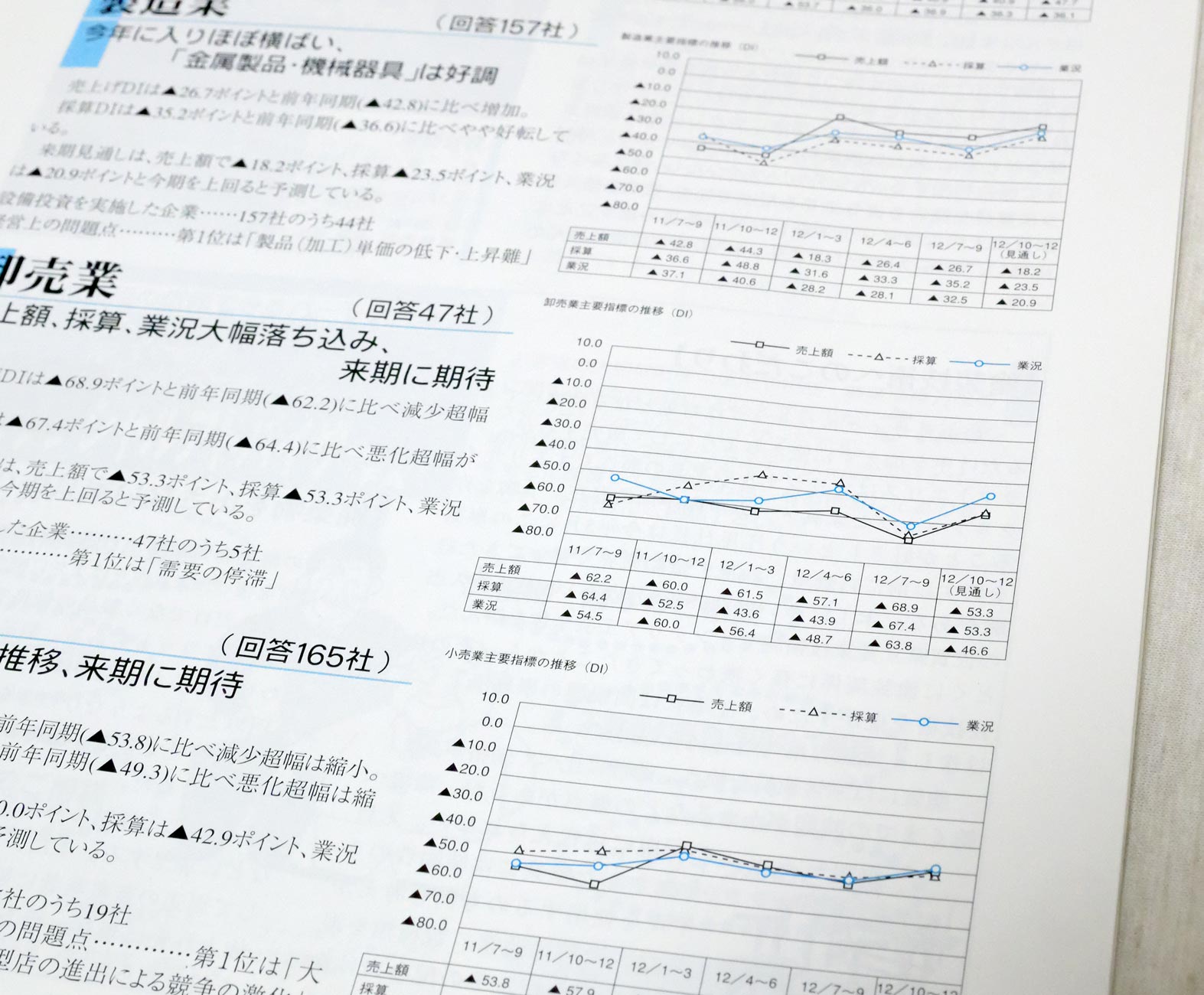 佐賀県内の中小企業に配布されている、県内の経済動向などを伝える冊子につきまして、表紙以外の組版デザイン・作図・グラフ作成など全てを1人で担当しました。読むぶんには特別な何かを感じることはないと思いますが、Adobe InDesign をつかって僅か2営業日で全20ページを作成するというスピード感で仕上げました。